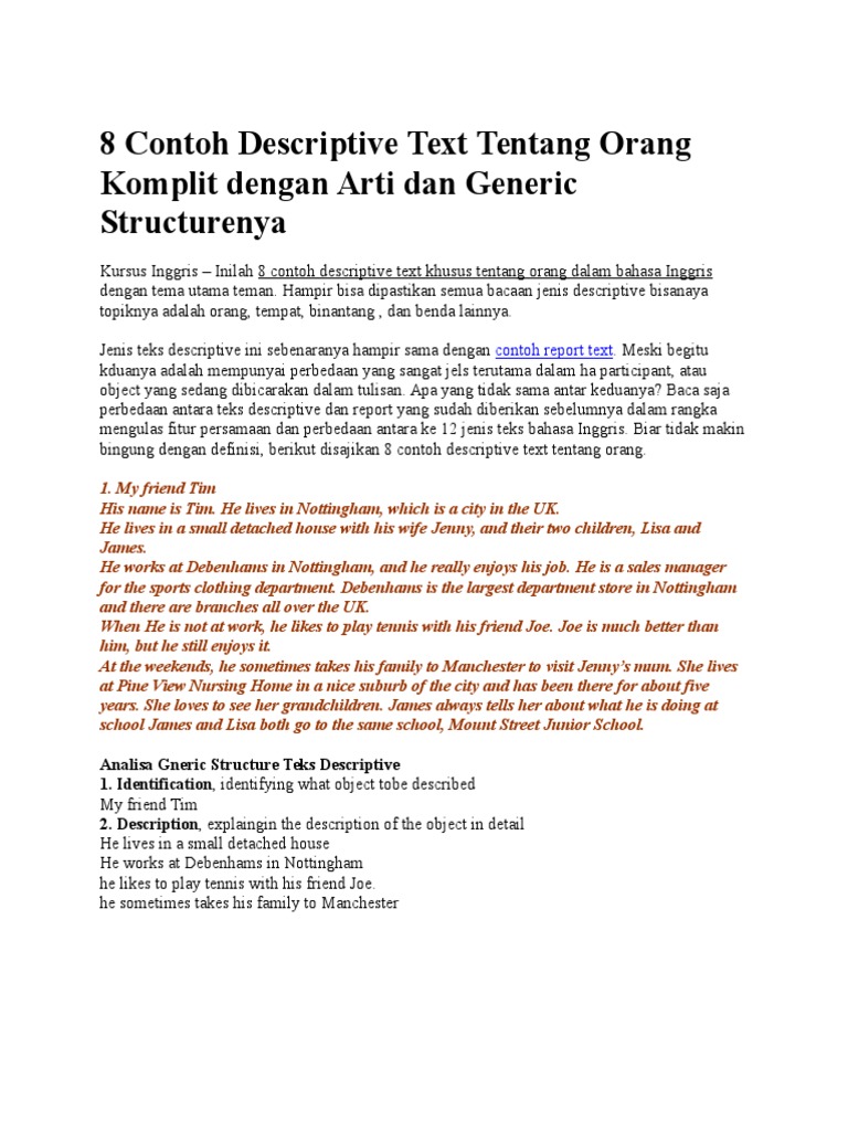 Descriptive text adalah teks yang berfungsi untuk mendeskripsikan karakteristik seseorang, binatang, benda, atau tempat secara detail/spesifik. Bambang is an english teacher. Home » descriptive text, english viii, un preparation » soal soal descriptive text (teks rumpang) soal soal descriptive text (teks rumpang) written by demi yurfina on saturday, april 23, 2016 | 5:20 am. Pada kesemptan kali ini ibi kan membahas tentang pengertian, ciri, struktur, tujuan dan contoh dari descriptive text, mari kita simak. He has long, straight hair, bright eyes and a friendly smile. He is fourteen years old and four years younger than me. Let me tell you about my bedroom. Peter is interested in sports very much, and at school, he plays football. Dalam bahasa inggris terdapat beberapa jenis text, yaitu narrative, report, descriptive, procedure dan yang lainnya.dari jenis yang sudah disebutkan salah satunya adalah descriptive text. Soal dan jawaban descriptive text borobudur temple. Sometimes he is rather naughty at home, but he usually does what he is asked to do. In the centre of my room, there is my bed. However it is likely you still need to read what is descriptive text before continuing the following short text sample.